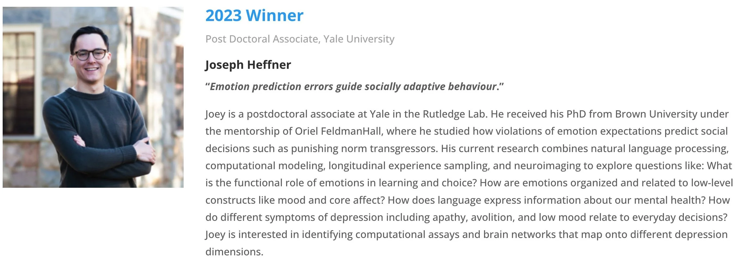 Joey wins SNE’s best dissertation award for his beautiful set of studies investigating how “Emotion prediction errors guide socially adaptive behavior”. Well done Joey!